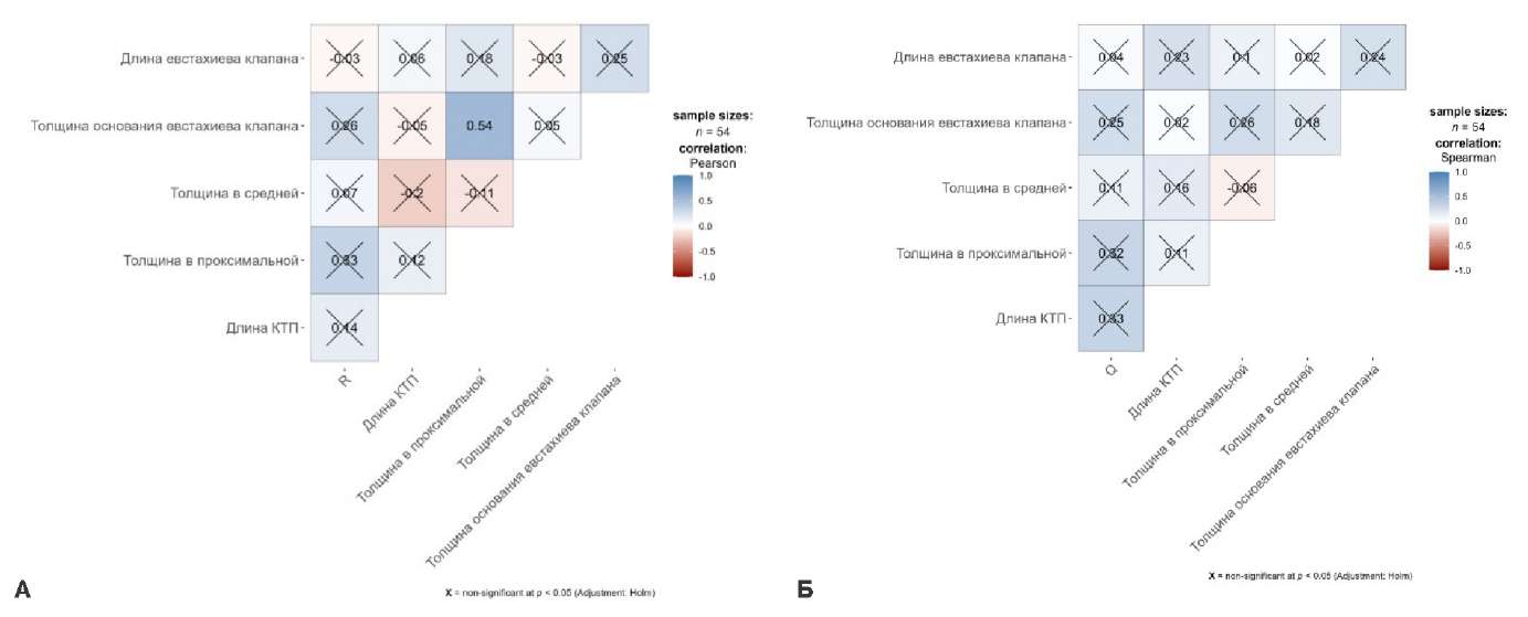 Проведен анализ ассоциации анатомических параметров (длина КТП в диастолу, толщина в проксимальной части, толщина в средней части, толщина основания евстахиева клапана, длина евстахиева клапана) с внутриоперационными данными: длительность операции и длительность рентгеноскопии. Анализ включал последовательную проверку линейных и нелинейных связей с использованием линейной регрессии и обобщенно аддитивной модели. Построены корреляционные матрицы с целью выявления ассоциаций между зависимыми и независимыми переменными (рис. 3).