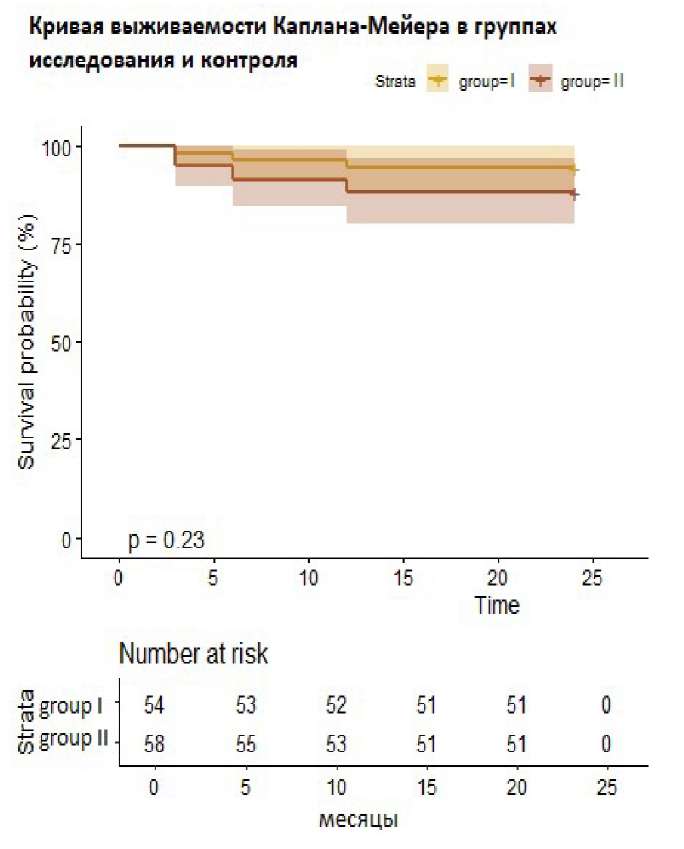 Анализ выживаемости также не выявил достоверных различий между исследуемыми группами.