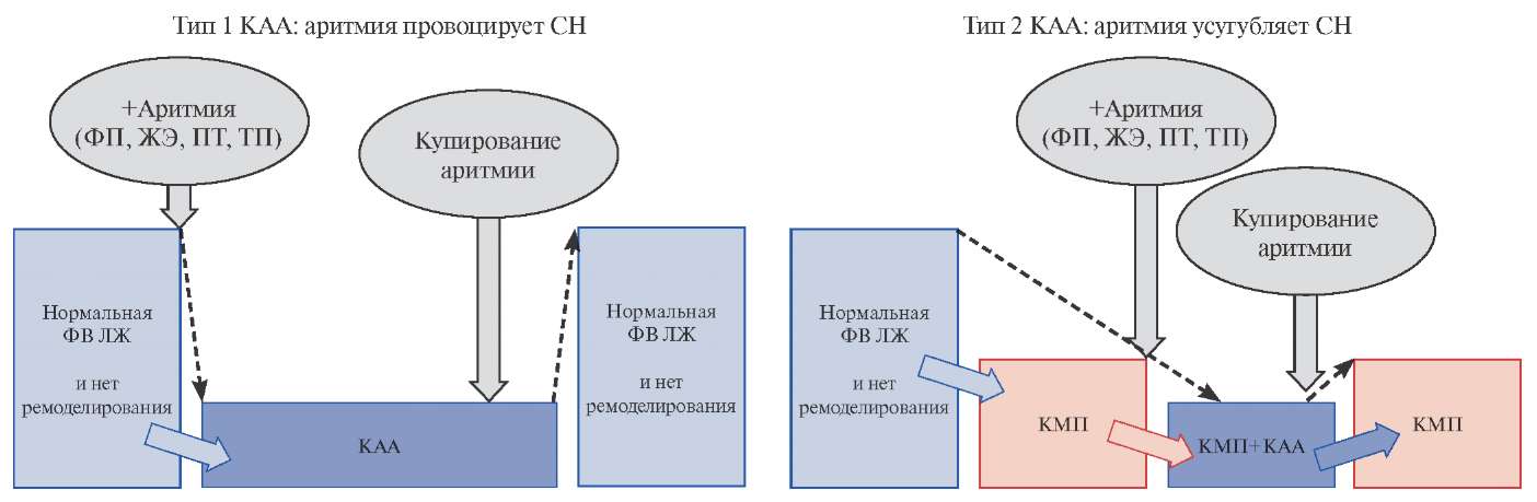 Примечание: Панель 1: появление нарушения ритма сердца провоцирует развитие кардиомиопатии, а после купирования аритмии восстанавливается функция и размеры сердца, исчезают проявления СН. Панель 2: КАА манифестирует при возникновении аритмии на фоне имеющегося заболевания сердца с предсуществующей кардиомиопатией; состояние пациента и функция желудочков являются, по факту, сочетанием двух кардиомиопатий — исходной и КАА; после купирования КАА возможно улучшение функции желудочков и компенсация состояния вплоть до предсуществующего уровня. Часто данный тип относят к декомпенсации СН при нарушениях ритма.