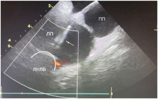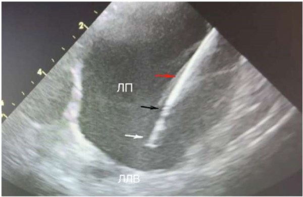 Рис. 5. Буж и шифт в полости ЛП. Белой стрелкой указан буж, красной — шифт, черной — граница между шифтом и бужом.