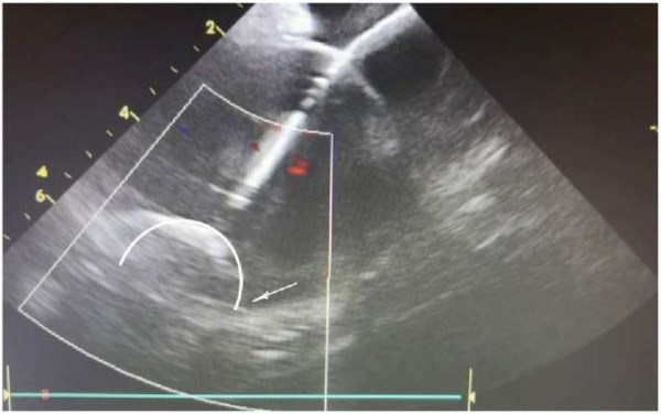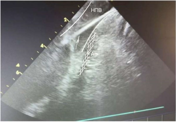 Основными УЗ анатомическими ориентирами при проведении УЗ катетера являются подвздошные артерии, брюшная аорта, печень. Для выведения данного изображения необходимо плавно провести датчик эхокардиографии по подвздошной вене, развернув основную метку (нижнюю неподвижную) в области 3 часов. Если возникают трудности в прохождении датчика в нижней полой вене (НПВ) — верхнюю метку датчика (A/P) нужно плавно повернуть в сторону метки «A». По УЗ исследованию: датчик нырнет в просвет НПВ, плавно продвигаем датчик далее в просвет на 1-2 см, после — поворачиваем метку «А» в исходное положение (рис. 1).