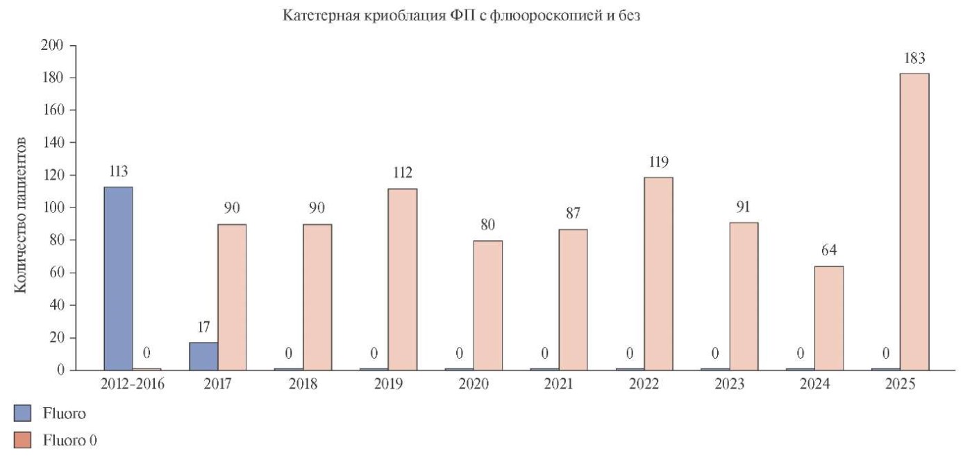 Криобаллонная аблация (КБА) наряду с радиочастотной аблацией и аблацией высоким импульсным полем зарекомендовала себя как безопасный и не уступающий другим по эффективности метод с короткой кривой обучения и минимальными временными затратами. Методика КБА фибрилляции предсердий (ФП) подразумевает окклюзию устьев лёгочных вен криобаллоном, что подтверждается отсутствием протекания контрастного вещества из целевой вены на обзорной рентгеноскопии. После чего на устье окклюзированной вены наносится криовоздействие. Во многих работах было показано негативное влияние рентгеноскопии на организм человека. Особенно актуально это становится в центрах, осуществляющих выполнение большого объема оперативных вмешательств. В данной работе представлены непосредственные и отдаленные результаты нефлюороскопической КБА ФП с описанием методологии. Данная методика подразумевает манипуляции в сосудах и полостях сердца под контролем внутрисосудистого ультразвукового исследования (ВСУЗИ), что исключает введение контрастного вещества, ионизирующего излучения, с одновременным мониторированием положения инструментов в полостях сердца, а также эхо-свободного пространства. Методика описана пошагово и иллюстрирована скриншотами ВСУЗИ с пояснениями. Опыт применения нефлюороскопической методики КБА ФП в клинике более 8 лет показал, что её эффективность и безопасность не уступает классической с применением флюороскопии и венографии, исключает негативное воздействие ионизирующего излучения и рентгенконтрастного вещества, сохраняет принцип «одного выстрела», не увеличивает время операции, воспроизводима.