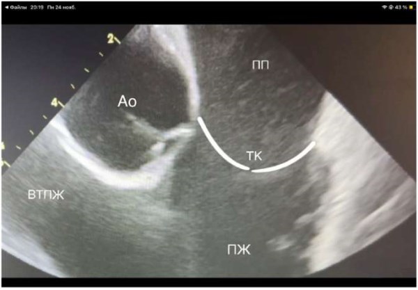 Сокращения: Ао — корень аорты, ВТПЖ — выходной тракт правого желудочка, ПЖ — правый желудочек, ПП — правое предсердие, ТК — трикуспидальный клапан.