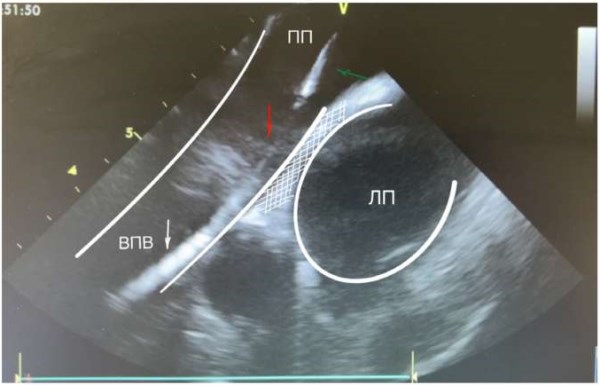 Рис. 4. На изображении выведены: проводник (белая стрелка) с шифтом (зеленая стрелка) и бужом (красная стрелка) в ВПВ. Белым контуром выделены ВПВ и ЛП. Стенка ВПВ, переходящая на межпредсердную перегородку (заштрихованная белым зона).