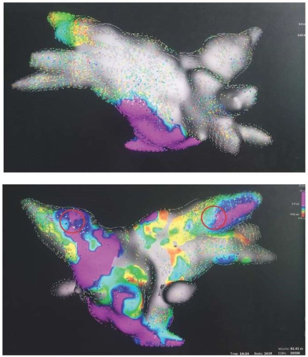 Примечание: воздействия в выделенных зонах привели к купированию и неиндуцируемости ФП (материалы архива лаборатории хирургических и рентгенхирургических методов лечения нарушений ритма сердца отдела сердечно-сосудистой хирургии института клинической кардиологии ФГБУ «НМИЦК им. акад. Е. И. Чазова» Минздрава России).